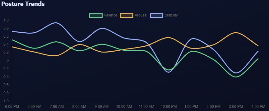 The system detects hundreds of emotions (the system has detected more than 200!)— happy, sad, frustrated, confused… all have a “valence” score associated with them. Angry might be -.4, while joyful might be +.4. Stability is all the emotions— good, bad, neutral, calculated together. Arousal is the STRENGTH of all of them at that time period.